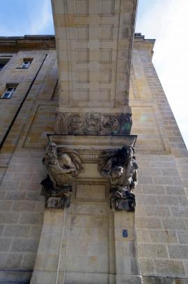 Die übrigen drei Seiten sind seit ihrem Wiederaufbau nur wenig verziert. Ebenfalls erhalten ist eine der beiden Brücken, die das Grundgebäude und den Erweiterungsbau miteinander verbinden. Die reich verzierte Brücke wird von vier Atlanten gehalten, die die vier Elemente zeigen.